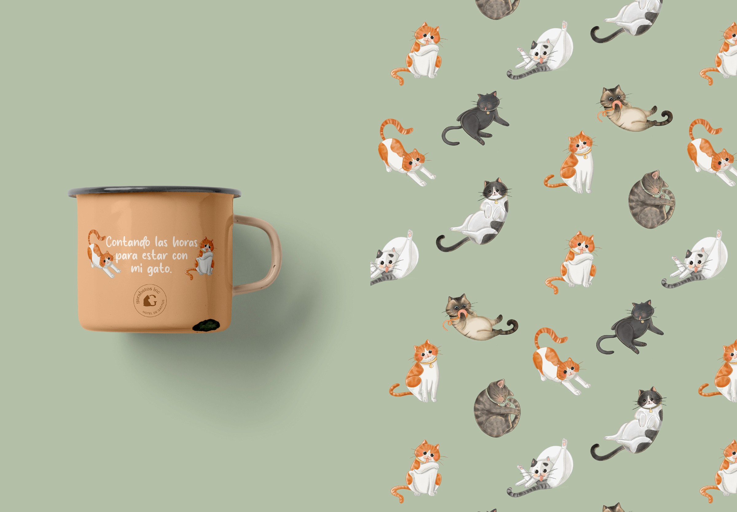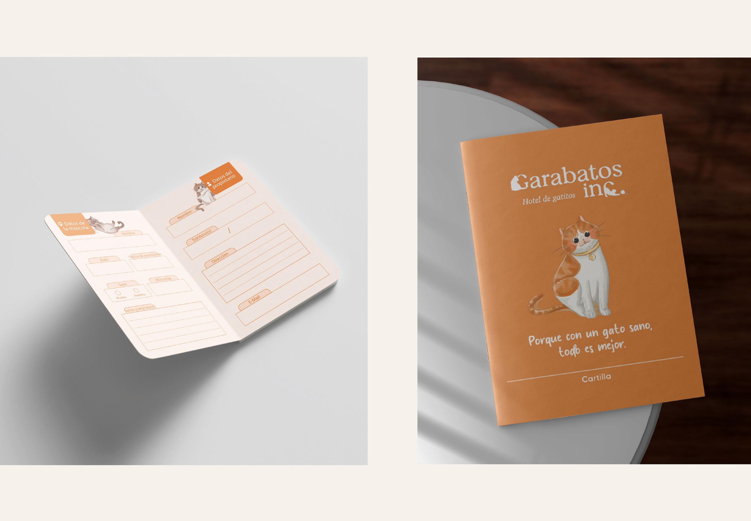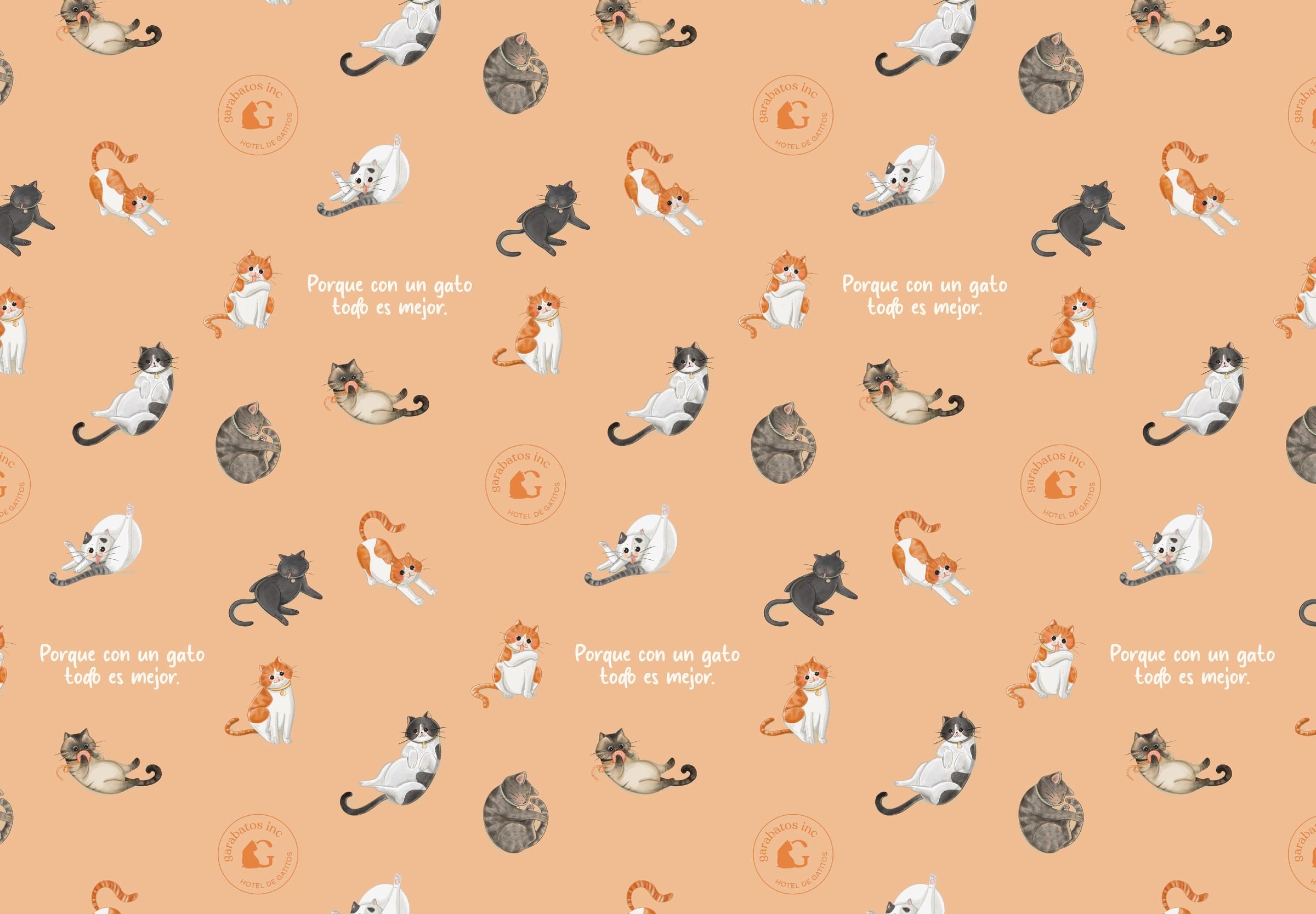 Dimos un giro completo a su identidad visual, cuidando siempre de conservar la esencia que los hace únicos. Diseñamos un logotipo que integra de manera creativa las siluetas de dos gatitos dentro del nombre de la marca, reforzando su carácter amigable y especializado. Uno de los elementos más entrañables del proyecto fueron las ilustraciones de gatitos reales, clientes frecuentes del hotel. Entre ellos destaca el gato naranja, “Garabatos”, mascota de los fundadores y protagonista de la marca. Creamos ilustraciones de él en distintas posiciones para utilizar en su sitio web, materiales impresos y señalética del espacio. Además, diseñamos patterns con estas ilustraciones para aplicarlos en la recepción y muros del hotel, creando una experiencia visual coherente, tierna y memorable. También desarrollamos el diseño de sus cartillas de vacunación, papelería corporativa y merchandising para quienes desean llevarse un recuerdo del hotel.